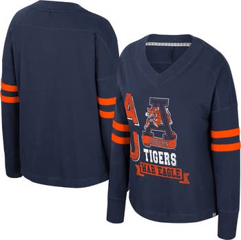 Show off your school pride in comfortable style with this Auburn Tigers Oversized Violet V-Neck Long Sleeve T-Shirt from Colosseum. The washed cotton fabric provides a comfortable, lightweight feel and a slightly distressed look. The oversized fit and dropped shoulders offer a relaxed fit, perfect for layering or lounging while showing your Auburn Tigers pride.