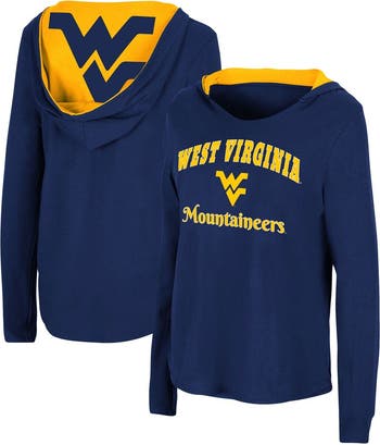 The Women's Colosseum Navy West Virginia Mountaineers Catalina Hoodie Long Sleeve T-Shirt is the perfect way to show your support for the Mountaineers. Made from soft cotton, this hoodie features a contrast-color hood lining and a hood without a drawstring for a comfortable fit. The rounded hem adds a touch of style, while the official West Virginia Mountaineers logo proudly displays your team spirit. Whether you're cheering on the Mountaineers at the game or just relaxing at home, this hoodie is sure to keep you warm and stylish.