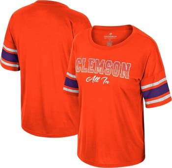 The Women's Colosseum Orange Clemson Tigers I'm Gliding Here Rhinestone T-shirt is the perfect way to show your support for the Clemson Tigers. With its screen print graphics and rhinestone embellishments, this shirt is sure to turn heads. Contrasting sleeve stripes add a touch of style, while the polyester and rayon construction ensures all-day comfort. Whether you're cheering at the game or showing support around town, this shirt is a must-have for any Clemson fan.