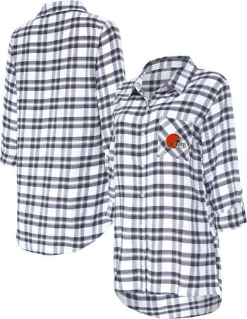 Show off your unwavering fandom as you dream of Cleveland Browns wins with this Sienna full-button nightshirt from Concepts Sport. It features the team logo embroidered on the chest and a woven plaid pattern that is comprised of their iconic colors. Pin-up sleeves and a rounded droptail hem make this Cleveland Browns top great for dozing off in style.