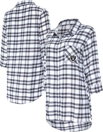 Show off your unwavering fandom as you dream of Las Vegas Raiders wins with this Sienna full-button nightshirt from Concepts Sport. It features the team logo embroidered on the chest and a woven plaid pattern in their iconic colors. Pin-up sleeves and a rounded droptail hem make this Las Vegas Raiders top great for dozing off in style.