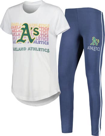 Rest comfortably and dream of your Oakland Athletics taking the chip in this Concepts Sport Sonata sleep set. It includes a T-shirt and pants, both with distinct Oakland Athletics graphics for a fresh look. Plus, the pant's adjustable waistband customizes the fit to your liking.