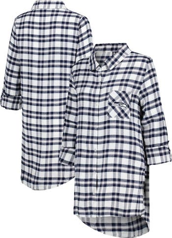 Show off your unwavering fandom as you dream of Seattle Seahawks wins with this Sienna full-button nightshirt from Concepts Sport. It features the team logo embroidered on the chest and a woven plaid pattern that is comprised of their iconic colors. Pin-up sleeves and a rounded droptail hem make this Seattle Seahawks top great for dozing off in style.