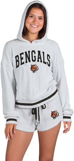 Stay comfortable and stylish while showing your Cincinnati Bengals pride with this Whitley Long Sleeve Hoodie Top & Shorts Set from Concepts Sport. This stylish set includes a long sleeve hoodie top and matching shorts, allowing you to showcase your Cincinnati Bengals pride in ultimate comfort. The hoodie features rib-knit cuffs and hem for a snug fit, while the shorts have an elastic waistband with a drawstring for a personalized feel. This set is perfect for lounging at home, catching some Z's or showing off your team spirit.