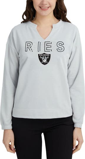 Represent your Las Vegas Raiders with the Women's Concepts Sport Gray Las Vegas Raiders Sunray Notch Neck Long Sleeve T-Shirt. This comfortable tee features a French terry lining for warmth and embroidered Las Vegas Raiders graphics that proudly display your team spirit. The elastic cuffs provide a secure fit, making it perfect for cheering on the Raiders from the stands or showing your support wherever you go.