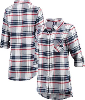 Sleep in comfort and style when you wear this New England Patriots Accolade Flannel button-up nightshirt from Concepts Sport. It features the New England Patriots logo embroidered on the chest pocket and a classic plaid pattern. A longer hem in the back also provides a more relaxing fit.