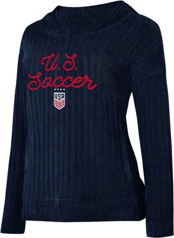 The Women's Concepts Sport Navy USWNT Linger Long Sleeve Hooded Top is the perfect way to show your support for the US Women's National Team. With its embroidered graphics and raised details, this top is sure to turn heads. The knit design and hood without a drawstring provide a comfortable and stylish fit, while the two front pockets and droptail hem with side splits add a touch of functionality. Whether you're cheering on the USWNT at the stadium or just showing your support around town, this top is a must-have for any fan.