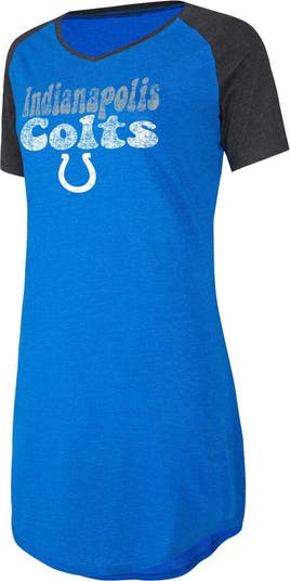 Sweet dreams of Indianapolis Colts victories await you in this V-neck nightshirt from Concepts Sport. It features Indianapolis Colts graphics printed in a distressed design on soft knit fabric. Contrast-color raglan sleeves create wider arm room for more comfortable movement.