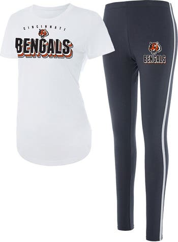 Sometimes you like to cheer on the Cincinnati Bengals from the comfort of your home, and this Concepts Sport Sonata set makes it that much easier. Includes a comfortable tee and leggings with eye-catching Cincinnati Bengals graphics and details. This set's soft, stretchy fabric also offers a casual feel.