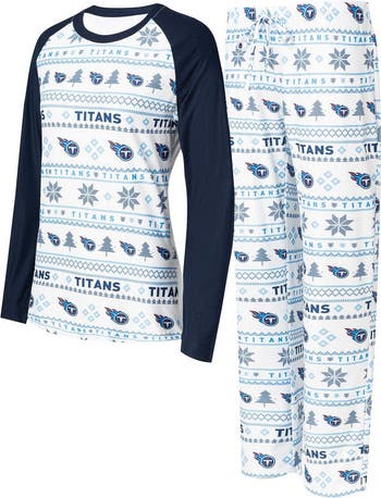 Combining comfort with your Tennessee Titans fandom is easy thanks to this Concepts Sport Tinsel Sleep set. It includes a soft tee with roomy raglan sleeves and pants with an adjustable waist and open-leg silhouette. Each piece features spirited Tennessee Titans graphics that also spotlight your love for the winter season.