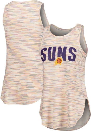 Celebrate your unwavering Phoenix Suns fandom with the Women's Concepts Sport White Phoenix Suns Sunray Tank Top. Its distressed screen-print graphics and rounded hem with side splits add a touch of style to your game day attire. Crafted from a comfortable rayon, polyester, and spandex blend, this tank top proudly displays your Phoenix Suns pride, making it the perfect way to show your support for the team and the NBA.