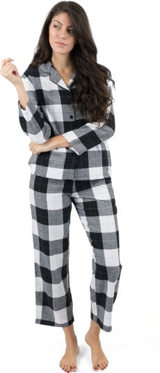 Stay warm and festive with our Women’s Cotton Flannel Holiday Pajama Set, crafted from soft 100% cotton flannel. This timeless two-piece set includes a button-front long sleeve shirt and full-length pants with an elastic waistband and adjustable drawstring for the perfect fit. Available in holiday solids and plaids, from classic red and green to black & white and other cozy check patterns, these pajamas are ideal for lounging, sleeping, and celebrating the season. Designed as cozy holiday loungewear, they also make a thoughtful holiday gift and complete the look with matching family Christmas pajamas for holiday photos and gatherings.