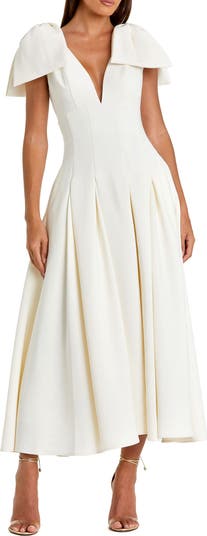 This crepe A-line midi dress features charming bow straps and a clean, feminine silhouette perfect for day-to-night occasions.