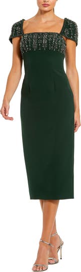 Elegance refined—this midi dress features cap sleeves and a beaded bodice, perfect for cocktail parties, weddings, or evening events.