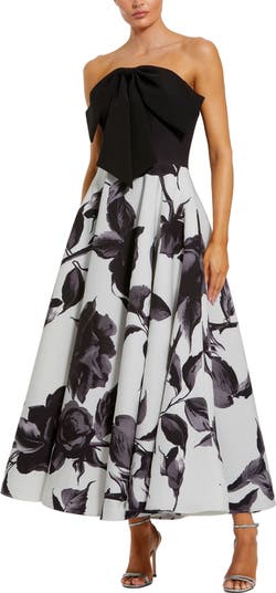 Make a statement in this strapless floral gown featuring an oversized bow, fitted bodice, and full A-line skirt. A perfect mix of elegance and modern flair.