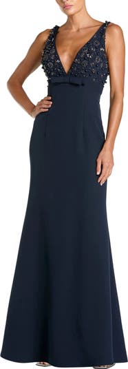 Women's Crepe Sleeveless Beaded V Neck Gown With Bow