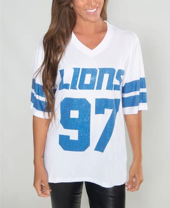 Elevate your look for game day with this elegant Detroit Lions Aidan Hutchinson Crystal V-Neck Tunic from Cuce. The stylish tunic design drapes effortlessly, offering a flattering silhouette that's both comfortable and chic. Sparkling crystal accents around the team logo and Aidan Hutchinson's number add a touch of glamour, ensuring you stand out in the crowd. Show off your Detroit Lions pride with this unique and eye-catching piece that seamlessly blends sophistication with team spirit.