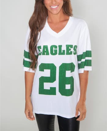 Elevate your look for game day with this elegant Philadelphia Eagles Saquon Barkley Crystal V-Neck Tunic from Cuce. The stylish tunic design drapes effortlessly, offering a flattering silhouette that's both comfortable and chic. Sparkling crystal accents around the team logo and Saquon Barkley's number add a touch of glamour, ensuring you stand out in the crowd. Show off your Philadelphia Eagles pride with this unique and eye-catching piece that seamlessly blends sophistication with team spirit.