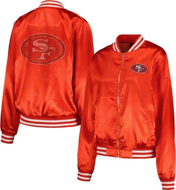 Make a dazzling impression on game day in this San Francisco 49ers Varsity jacket from Cuce. It features the team logo embroidered on the front and displayed in sparkly rhinestones across the back. Lustrous satin fabric and traditional stripe trim add the final stylish touches to this San Francisco 49ers full-zip.
