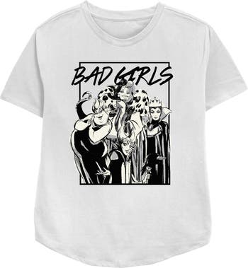- Own the moment with this stylish new women's relaxed fit t-shirt that is perfect for every occasion! Featuring sketched versions of Maleficent, Cruella de Vil, Evil Queen, and Ursula, along with the phrase: "Bad girls" printed above them.