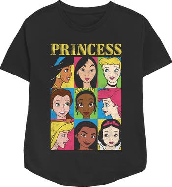 - Strut your stuff with this stylish new women's relaxed fit t-shirt that is perfect for every occasion! Featuring colorful squares with Jasmine, Mulan, Cinderella, Belle, Tiana, Ariel, Aurora, Tiana, and Snow White in distressed print across the front.