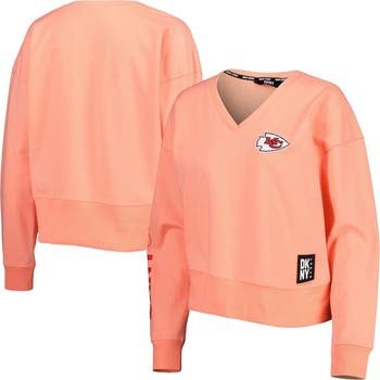 Represent your Las Vegas Raiders with the Women's DKNY Sport White Las Vegas Raiders Lily V-Neck Pullover Sweatshirt. This midweight sweatshirt features dropped shoulders and French terry lining for comfort, while the embroidered and screen print graphics proudly display your Raiders allegiance. Whether you're cheering from the stands or simply showing your support, this pullover is the perfect way to represent the Las Vegas Raiders in style.