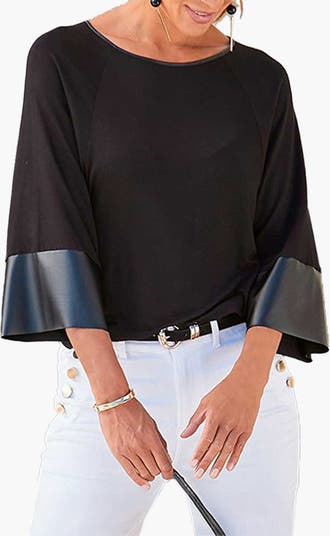 The LASCANA Women's Dolman Sleeve Leather Trim Top blends contemporary style with exceptional comfort, making it a standout piece in your wardrobe. Featuring relaxed dolman sleeves and sleek leather trim accents, this top offers a modern and sophisticated look. The soft, breathable fabric ensures all-day comfort, while the loose fit provides a flattering silhouette suitable for all body types. Perfect for both casual outings and dressier occasions, it pairs effortlessly with jeans, skirts, or tailored pants. Elevate your style with this versatile top that adds a touch of elegance to any outfit.