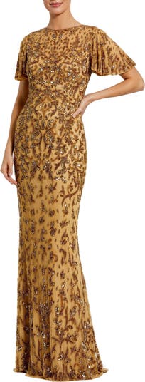 Radiate elegance in this gown with intricate beading, flutter sleeves, and a curve-hugging silhouette—perfect for formal galas or weddings.