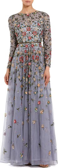 This embellished gown exudes elegance and glamour with a high neckline, long sleeves, and allover embellishments—perfect for evening affairs and black-tie events.