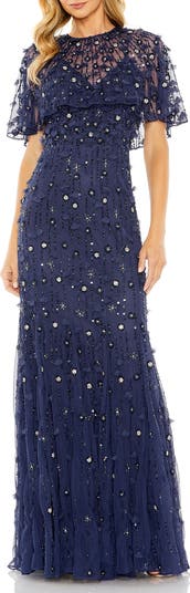 Women's Embellished Illusion Cape Sleeve Trumpet Gown