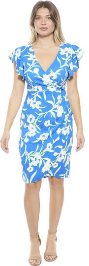 Womens Essential Floral Flutter Sleeve Faux Wrap Knee Length Dress