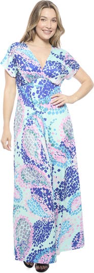 Elevate your wardrobe with the 24seven Comfort Apparel blue abstract print womens maxi dress, where formal elegance meets all day comfort. Featuring a flattering V neckline, V cut back, cap sleeves, and a defined empire waist, the flared A line full length skirt creates a graceful silhouette. Crafted from soft, stretchy fabric, it is machine washable for easy care, perfect for special occasions or a standout date night look.