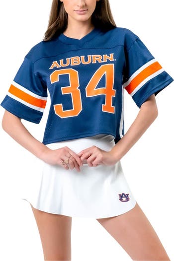 The Women's Established & Co. Navy Auburn Tigers Fashion Boxy Cropped Football Jersey is the perfect way to show your support for the Auburn Tigers. This stylish jersey features a boxy fit, cropped length, and mesh body for a comfortable and flattering look. The sewn-on stripes and V-neck add a touch of classic football style, while the Auburn Tigers logo proudly displays your team spirit. Whether you're cheering from the stands or just showing your support, this jersey is sure to turn heads.