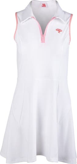 The Evonne Dress is made from lightweight, UV-protective stretch pique fabric blended with lycra spandex for a breathable, performance-ready fit. Designed as a sleeveless athletic style, it features a classic polo-inspired collar with a zip front, soft pink contrast trim, and our signature embroidered crossed-heart logo on the chest, plus an additional crossed-heart logo detail at the back neck. Perfect for both elegance and ease on and off the court. Inspired by the legendary Evonne Goolagong Cawley, whose graceful game and timeless style defined an era, this dress captures her effortless charm while updating it with modern performance fabrics and detailing.