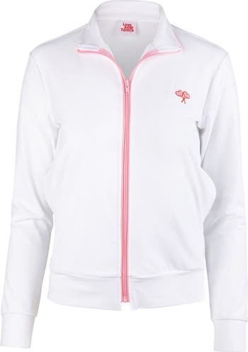 The Evonne Full Zip Jacket is a court-to-club essential, crafted from lightweight, UV-protective nylon spandex for comfort and performance. Featuring a sleek silhouette with a full front zip in pink contrast trim, this jacket is finished with our signature embroidered crossed-heart logo on the chest. Designed with front pockets and a high collar, it offers versatility for layering before and after play.
