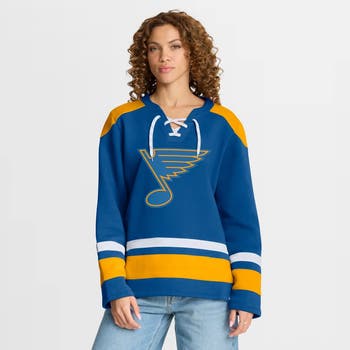 Showcase your love for the St. Louis Blues with this unique and stylish Icing Long Sleeve Lace Up Sweatshirt from Fanatics. The heavyweight material and fleece lining make it perfect for keeping warm during chilly game days or cold weather. Embroidered fabric applique on the chest proudly displays the St. Louis Blues logo, while sewn-on team-colored stripes add a touch of classic hockey style. With its classic fit that tapers at the waist, this sweatshirt offers a flattering silhouette, making it a must-have in your game day wardrobe.