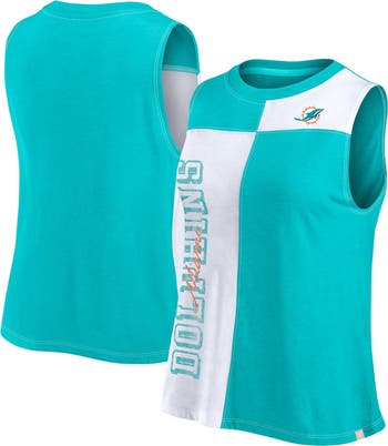 The Women's Fanatics Branded Aqua/White Miami Dolphins Script Color Block Tank Top is the perfect way to show your support for the Miami Dolphins. Made of a comfortable cotton-polyester blend, this tank top features heat-sealed and distressed screen-print graphics that showcase your Miami Dolphins pride. Contrast color stitching adds a stylish touch, while the tank's relaxed fit ensures a comfortable fit. Whether you're cheering at the stadium or relaxing at home, this tank top will make you feel like part of the team.