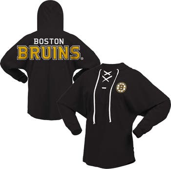The Women's Fanatics Branded Black Boston Bruins Jersey Lace-Up V-Neck Long Sleeve Hoodie T-Shirt is the perfect way to show your support for the Boston Bruins. This stylish and comfortable hoodie features a lace-up V-neck, dropped shoulders, and a rounded droptail hem. The low-puff screen print graphics proudly display the Boston Bruins logo, making it a must-have for any true fan. Whether you're cheering on the Bruins at the game or just relaxing at home, this hoodie is sure to keep you warm and comfortable.