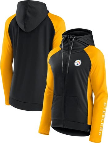 The Women's Fanatics Black/Gold Pittsburgh Steelers End Around Lightweight Raglan Full-Zip Hoodie Jacket is the perfect way to show your support for the Pittsburgh Steelers. Made from lightweight polyester, this hoodie is ideal for mild temperatures and features raglan sleeves for a comfortable fit. The rounded droptail hem and two front pockets add style and functionality, while the screen-printed graphics proudly display your Pittsburgh Steelers pride. Whether you're cheering on the Steelers at the stadium or relaxing at home, this hoodie is sure to keep you comfortable and stylish.