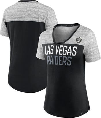 The Women's Fanatics Branded Black/Heathered Gray Las Vegas Raiders Close Quarters V-Neck T-Shirt is the perfect way to show your support for the Las Vegas Raiders. Made from a comfortable cotton and polyester blend, this shirt features a stylish V-neck and screen print graphics that proudly display your Raiders pride. The rounded hem with side splits adds a touch of flair, while the side splits at the waist hem provide a comfortable fit. Whether you're cheering on the Raiders at the stadium or just showing your support around town, this shirt is sure to turn heads.