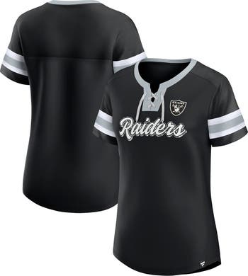 The Women's Fanatics Branded Black Las Vegas Raiders Original State Lace-Up T-Shirt is a stylish and comfortable way to show your support for the Las Vegas Raiders. The lace-up neckline and mesh sleeves add a touch of femininity, while the screen print graphics and sewn-on sleeve stripe proudly display your team pride. Made from durable polyester, this t-shirt is perfect for game day or any day you want to show your Raiders spirit.
