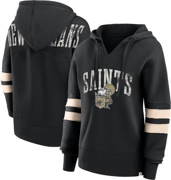 The Women's Fanatics Branded Black New Orleans Saints Bold Move Dolman V-Neck Pullover Hoodie is the perfect way to show your unwavering support for the New Orleans Saints. This midweight hoodie features distressed screen print graphics that showcase your team pride, while the fleece lining keeps you warm and comfortable during chilly game days. The V-neck design adds a touch of style, and the sewn-on sleeve stripes complete the look. Whether you're cheering from the stands or simply showing your support, this hoodie is the perfect way to represent the New Orleans Saints.