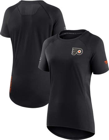 The Women's Fanatics Branded Black Philadelphia Flyers Authentic Pro Rink Raglan Tech T-shirt is the perfect way to show your support for the Philadelphia Flyers. Made from durable polyester, this T-shirt features screen-printed graphics that proudly display the Flyers logo and colors. The raglan sleeves and rounded droptail hem provide a comfortable and stylish fit, while the back neck taping and crew neck ensure a secure and comfortable fit. Whether you're cheering on the Flyers at the rink or just showing your team spirit, this T-shirt is a must-have for any Philadelphia Flyers fan.