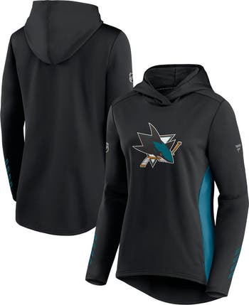 The Women's Fanatics Branded Black/Teal San Jose Sharks Authentic Pro Locker Room Pullover Hoodie is the perfect way to show your support for the San Jose Sharks. Made from lightweight polyester, this hoodie is ideal for mild temperatures and features contrast-color inserts and a hood without a drawstring. The rounded droptail hem adds a stylish touch, while the pullover design ensures easy wear. Whether you're cheering on the Sharks at the game or relaxing at home, this hoodie will keep you comfortable and stylish.
