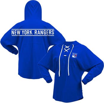 Celebrate your unwavering New York Rangers fandom with the Women's Fanatics Branded Blue New York Rangers Jersey Lace-Up V-Neck Long Sleeve Hoodie T-Shirt. This stylish and comfortable hoodie features dropped shoulders, low-puff screen print graphics, and a rounded droptail hem, making it the perfect choice for game day or everyday wear. The V-neck design adds a touch of sophistication, while the New York Rangers logo proudly displayed on the front and back showcases your unwavering support for the team.
