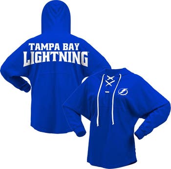The Women's Fanatics Branded Blue Tampa Bay Lightning Jersey Lace-Up V-Neck Long Sleeve Hoodie T-Shirt is the perfect way to show your support for the Tampa Bay Lightning. This stylish and comfortable hoodie features a lace-up V-neck, dropped shoulders, and a rounded droptail hem. The low-puff screen print graphics proudly display the Tampa Bay Lightning logo, making it the perfect way to show your team spirit. Whether you're cheering on the Lightning at the game or just relaxing at home, this hoodie is sure to keep you comfortable and stylish.