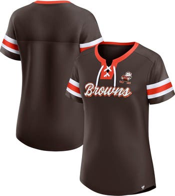 Celebrate your unwavering Cleveland Browns fandom with the Women's Fanatics Branded Original State Lace-Up T-Shirt. This stylish tee features a lace-up neckline, mesh sleeves and back panel, and a rounded hem, providing a unique and eye-catching look. The screen print graphics proudly display the iconic Cleveland Browns logo, while the sewn-on sleeve stripes add a touch of classic team spirit. Whether you're cheering from the stands or simply showing your support, this t-shirt is the perfect way to represent the Cleveland Browns in style.