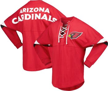 The Women's Fanatics Branded Cardinal Arizona Cardinals Spirit Jersey Lace-Up V-Neck Long Sleeve T-Shirt is the perfect way to show your unwavering support for the Arizona Cardinals. This stylish and comfortable shirt features dropped shoulders, low-puff screen print graphics, and a rounded droptail hem. The V-neck with lace-up detail adds a touch of femininity, making this shirt perfect for any Cardinals fan. Made from soft cotton, this shirt is sure to keep you comfortable all game long.