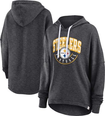 The Women's Fanatics Branded Charcoal Pittsburgh Steelers Lightweight Modest Crop Lounge Helmet Arch Pullover Hoodie is the perfect way to show your support for the Pittsburgh Steelers. Made from a soft and comfortable cotton-polyester blend, this hoodie features a lightweight design ideal for mild temperatures. The modest cropped length hits at the top of the waistband, and the rounded droptail hem adds a stylish touch. The distressed screen print graphics of the Pittsburgh Steelers helmet and arch logo proudly display your team pride. Whether you're cheering on the Steelers at the game or relaxing at home, this hoodie is sure to keep you comfortable and stylish.