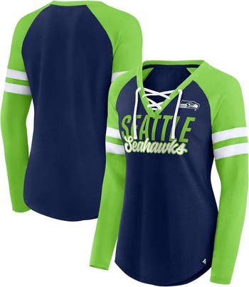 The Women's Fanatics Branded College Navy/Neon Green Seattle Seahawks True to Form Raglan Lace-Up V-Neck Long Sleeve T-Shirt is the perfect way to show your support for the Seattle Seahawks. With its raglan sleeves, rounded hem, and screen print graphics, this shirt is both stylish and comfortable. The sewn-on sleeve stripes and V-neck with lace-up detail add a touch of flair, while the cotton and polyester material ensures you'll stay comfortable all day long. Whether you're cheering on the Seahawks at the stadium or just relaxing at home, this shirt is sure to become a favorite.
